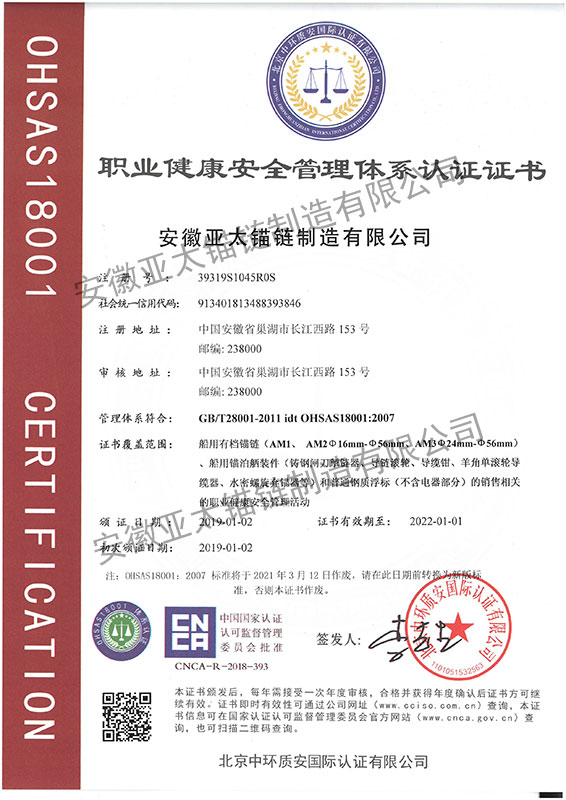 安徽亞太錨鏈制造有限公司是國家高新技術(shù)企業(yè),也是國家GB/T 549-2017《電焊錨鏈》標(biāo)準(zhǔn)的起草和制定單位之一。公司旗下設(shè)有錨鏈分廠、浮標(biāo)分廠、舾裝件分廠等多個分廠。公司專業(yè)從事φ12.5mm-φ107mm二、三級船用錨鏈、浮標(biāo)錨鏈、錨鏈附件,錨、船舶曬裝產(chǎn)品、航標(biāo)、系船浮、船型標(biāo)、多種規(guī)格海洋監(jiān)測浮標(biāo)及航標(biāo)燈等產(chǎn)品的生產(chǎn)、安裝和服務(wù)。目前公司的產(chǎn)品銷往全國各地船廠、碼頭、航標(biāo)處、航道局、海洋局,并已走上國際市場,如東南亞、中東、歐美等國家。